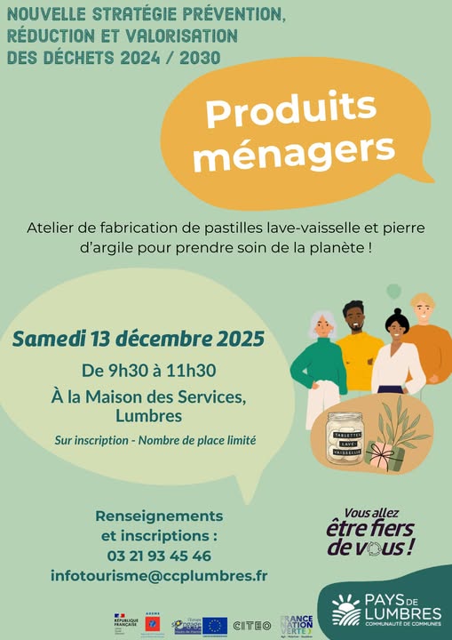 RETOUR Atelier de fabrication de produits ménagers le 13/12/2025 de 9H30 à 11H30 à la maison des services de Lumbres 04/12/2025 Divers