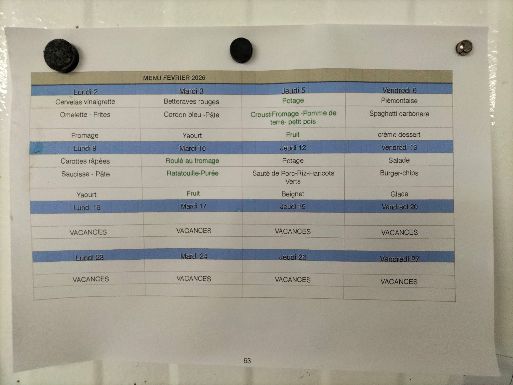 Menus de cantine de février 2026