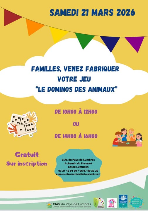 RETOUR Le samedi 21 mars 2026, au CIAS du Pays de Lumbres, venez fabriquer votre jeu " le Dominos des Animaux" 13/03/2026 Divers