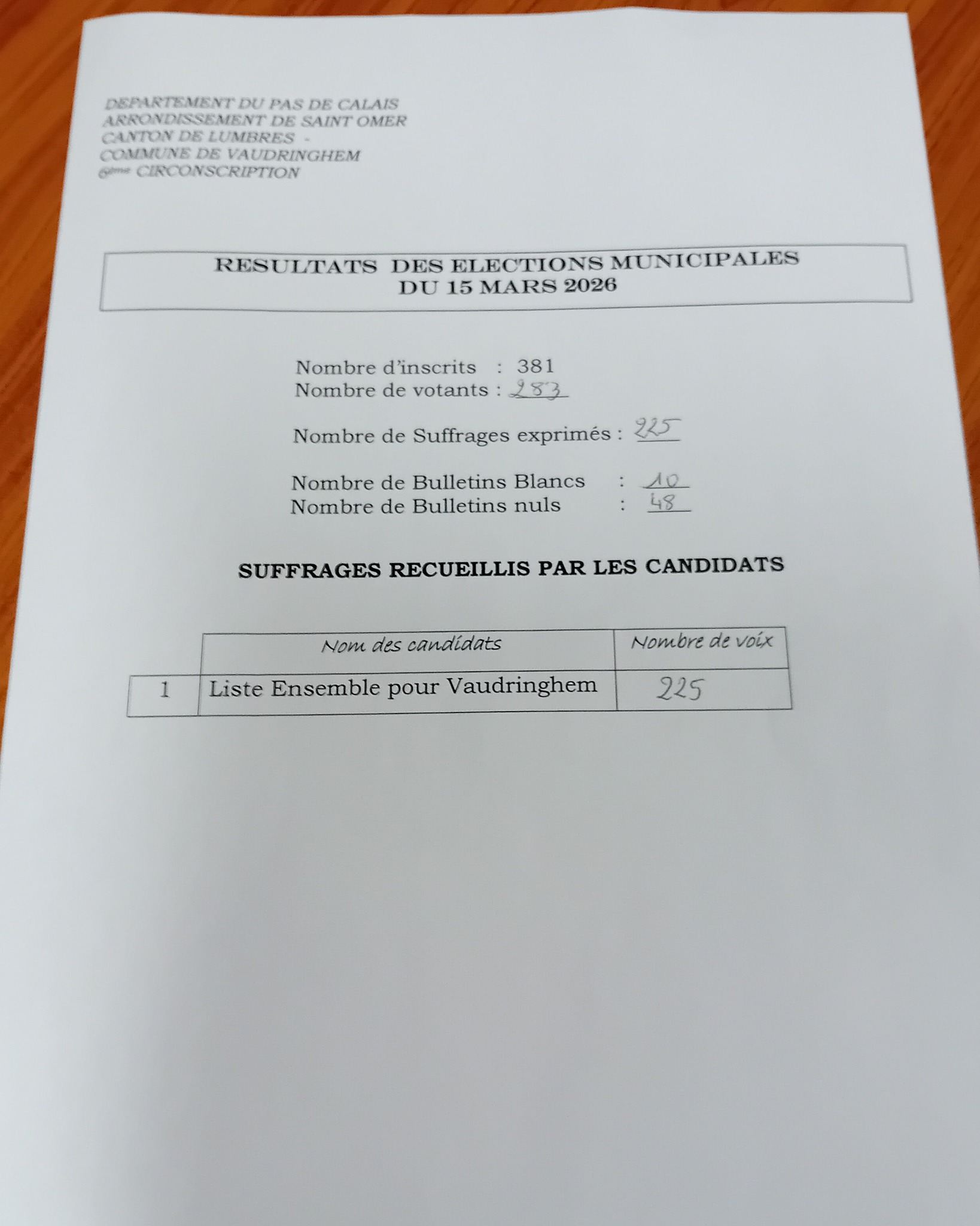 RETOUR résultats élections municipales du 15 mars 2026 18/03/2026 Divers L'équipe "Ensemble pour Vaudringhem" vous remercie de votre soutien.