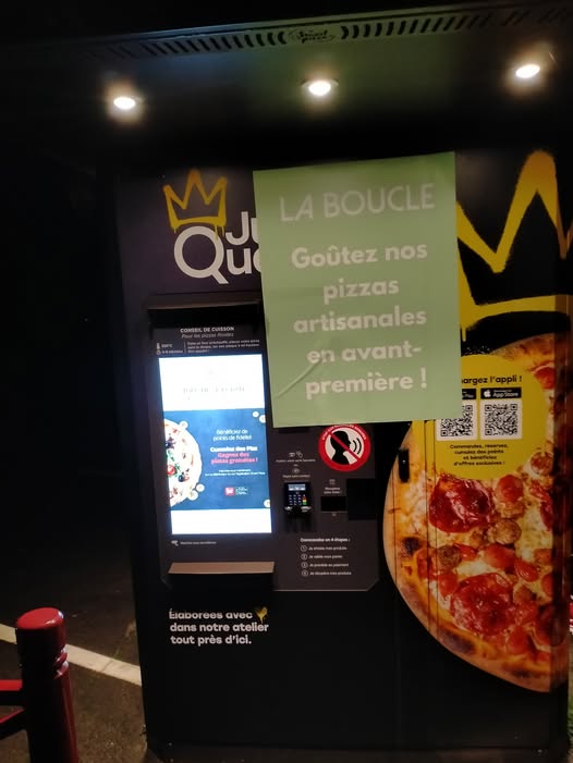 RETOUR Distributeur de pizzas à nouveau fonctionnel. Vous pourrez profitez d'une offre promotionnelle de - 5 euros pour toute 1ère commande passée depuis l'application Smart Pizza avec le code promo 620000. 20/11/2025