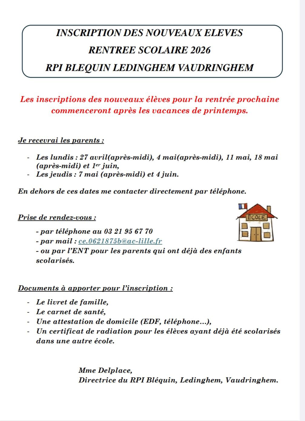 RETOUR Inscription des nouveaux élèves de la rentrée scolaire 2026 RPI Bléquin-Ledinghem-Vaudringhem 09/04/2026
