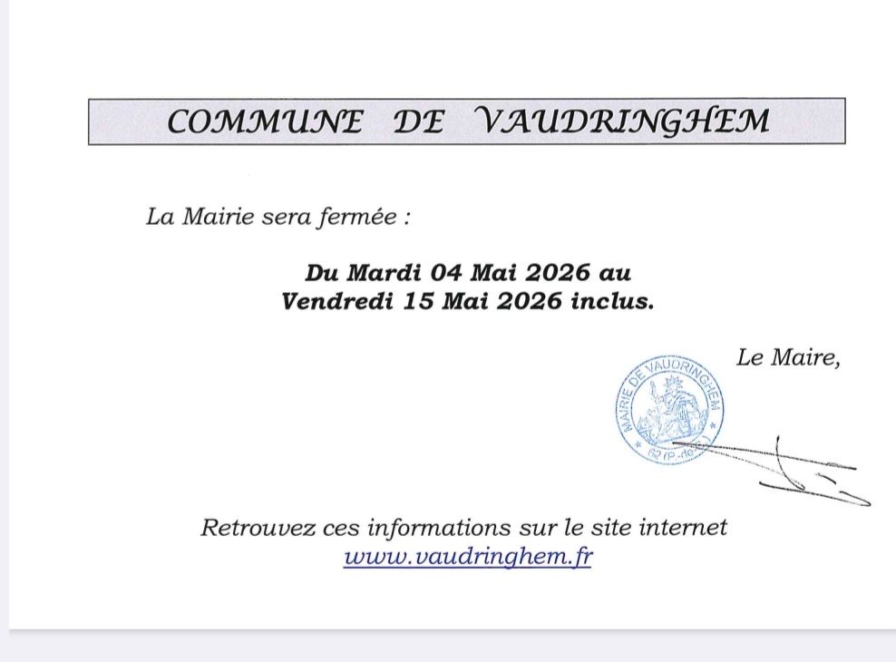 La mairie sera fermée du mardi 4 mai au vendredi 15 mai 2026.